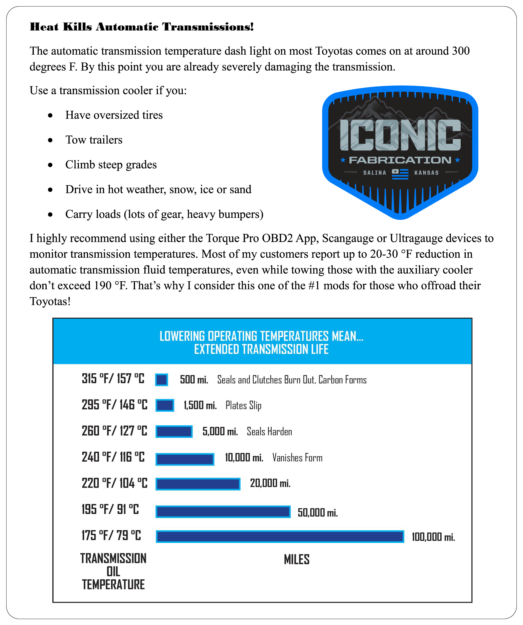 These CNC pressbroke .125" thick 5052 aluminum brackets are designed to make transmission cooler installs a breeze for all automatic transmission 3rd gen (1996-2002) 4runners! (Does NOT work for first gen Tacoma.) These fit the Hayden 678, Hayden 698, and Derale 13613 transmission coolers. The Hayden coolers are identical in size but the 698 is equipped with an internal temperature bypass which helps the fluid get up to operating temperature faster, recommended for colder climates. Reduce wear on the transmission by keeping temperatures cooler! You will have to remove or relocate one of the horns.